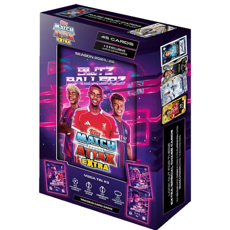 Gå “all in” på Match Attax Extra 2025/26 med en Extra Mega Tin – den perfekte mellemting mellem en lille opening og en hel box. Du får masser af kort, garanterede Limited Editions, og så er der altid den klassiske “måske er det den tin” spænding.